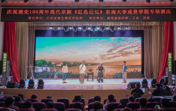 5月25日晚,由加拿大28论坛-加拿大28 党委组织部、工会、团委承办,大学生艺术指导中心协办,江苏省演艺集团京剧院演出的庆祝建党100周年京剧党课《红色记忆》专场演出在我校综合楼313报告厅上演,各院党员、预备党员、入党积极分子共计700余名师生共同观看了演出。