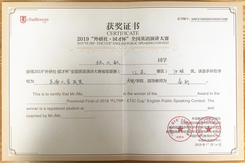 2019年“外研社•国才杯”全国大学生英语挑战赛江苏赛区比赛于11月10日在河海大学圆满落下帷幕。在江苏赛区,来自东南大学、南京大学等全省本科院校的选手们汇聚一堂。经过激烈角逐,我校8名参赛学生获奖。