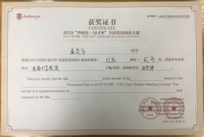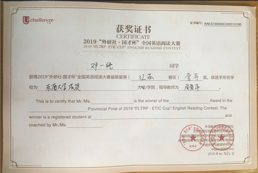 该挑战赛分为英语阅读大赛、英语写作大赛和英语演讲大赛三部分,在江苏赛区英语阅读大赛中,73所本科院校共223名选手参赛,我校2017级会计1班邓一纯(指导老师:周爱萍)荣获一等奖,在全省名列第十一;2017级建筑工程1班孟奕飞(指导老师:朱宇博)获得二等奖;2018级国贸2班蔡朵妍(指导老师:周爱萍)获得三等奖。