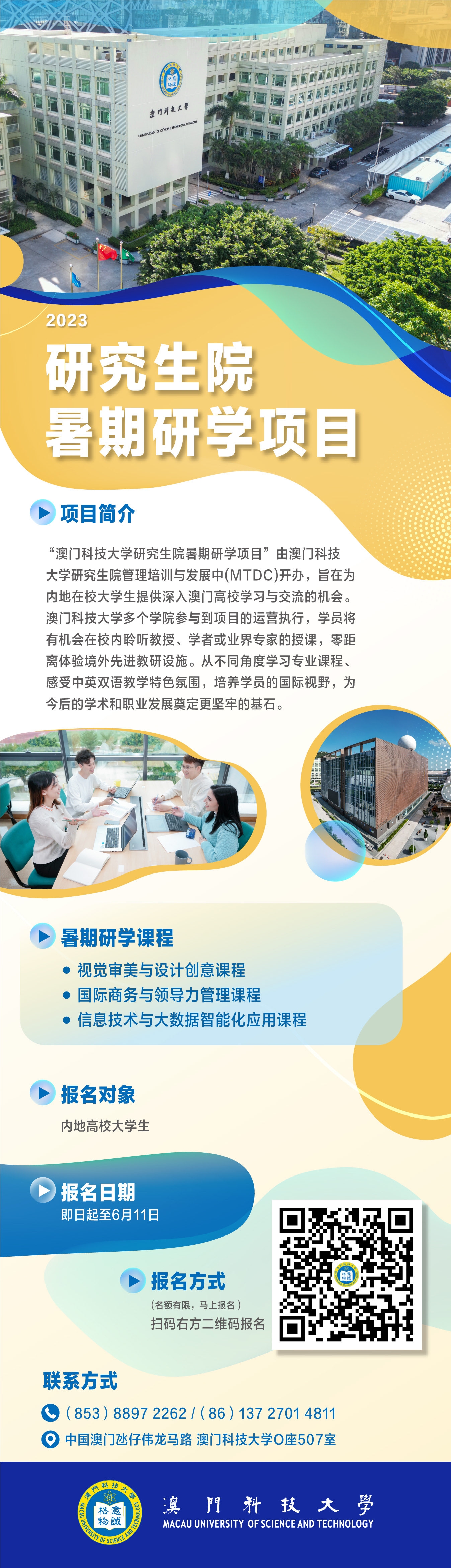 加拿大28论坛-加拿大28 与澳门科技大学双方积极开展教育合作与学生交流工作,在师生交流、学术及科研合作、资料交换合作以及研究生保荐计划方面签署了合作协议。澳门科技大学研究生院将推出2023年暑期研学项目,旨在为内地在校大学生提供深入澳门高效学习与交流的机会。学生将有机会在澳科大校内聆听教授、学者或业界专家的授课,零距离体验境外先进教研设施;从不同角度学习专业课程、感受中英双语教学特色氛围。感兴趣参加该研学项目的同学可扫描附件2中二维码,点击蓝字,了解暑期研学课程的详细课程安排、时间等信息,项目费用将根据实际安排确定。现将具体内容通知如下: